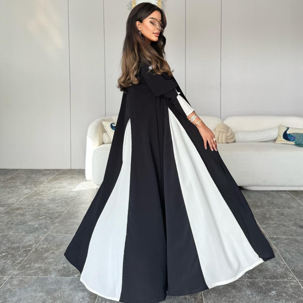 تألقي بإطلالة عصرية متجددة مع عباية كلوش قماش كوري اسود مع أوف وايت تجمع بين اللونين الأسود والأوف وايت في تصميم ناعم وانسيابي يلفت الأنظار ويمنحك إحساسًا بالفخامة والراحة في آنٍ واحد.