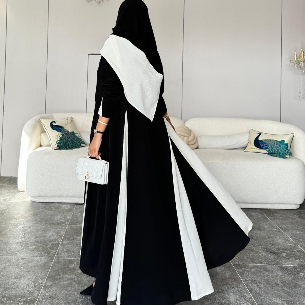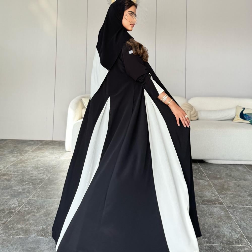 - الدمج بين اللون الأسود والأوف وايت يمنح العباية طابعًا أنيقًا ومميزًا يناسب جميع المناسبات.