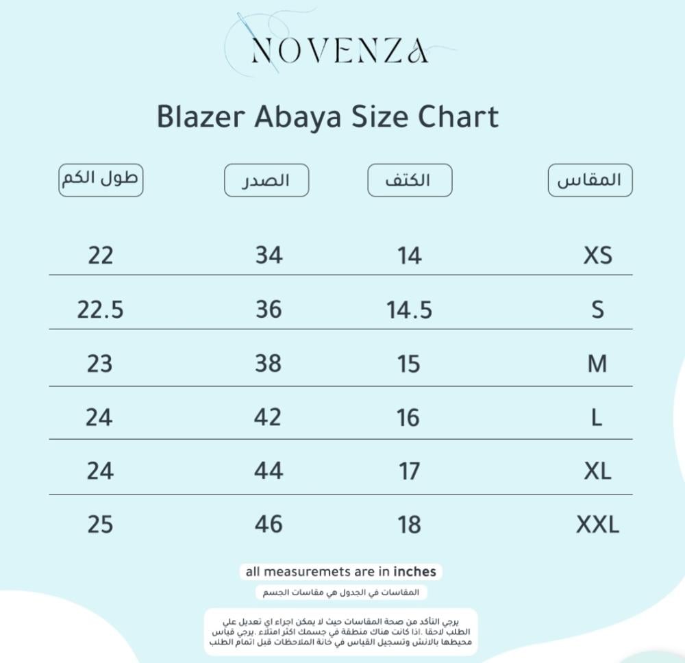 • بليزر عباية كحلي ذات لون صيفي منعش يضفي على إطلالتك لمسة من الحيوية الساحرة بسهولة.