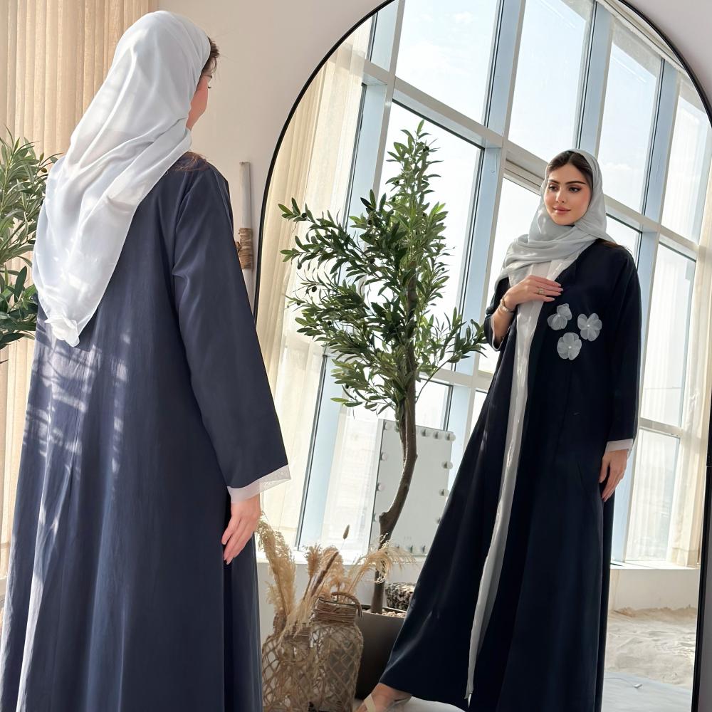 • تطريز ورود أنثوي يزين العباية بأسلوب فاخر.