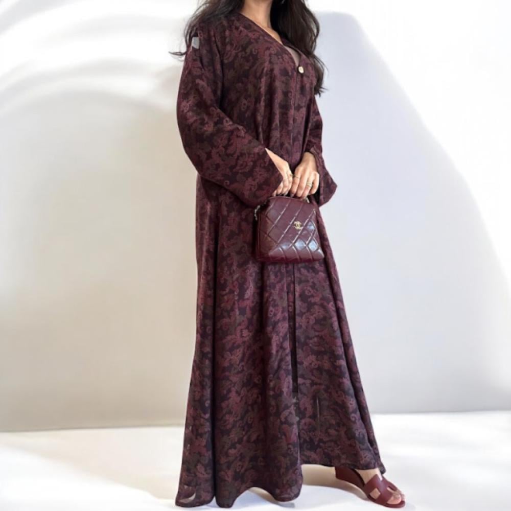 - تأتي العباية باللون العنابي الداكن الذي يضفي لمسة من الفخامة والجاذبية.