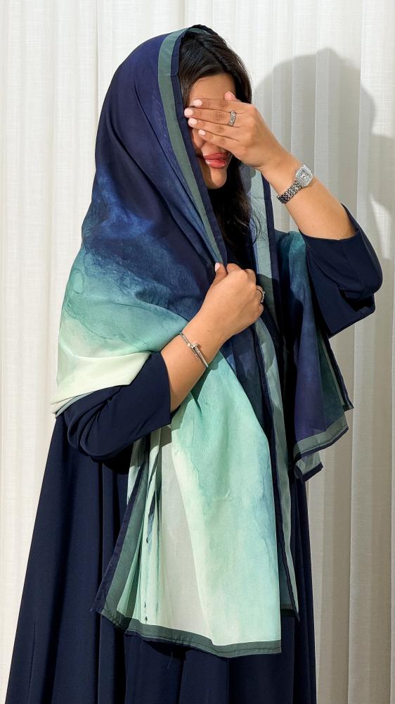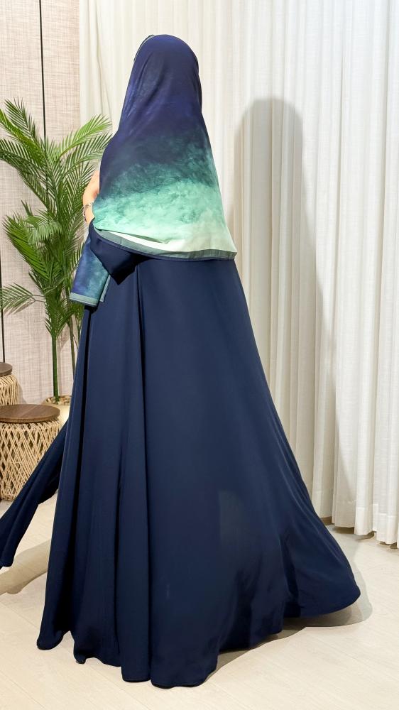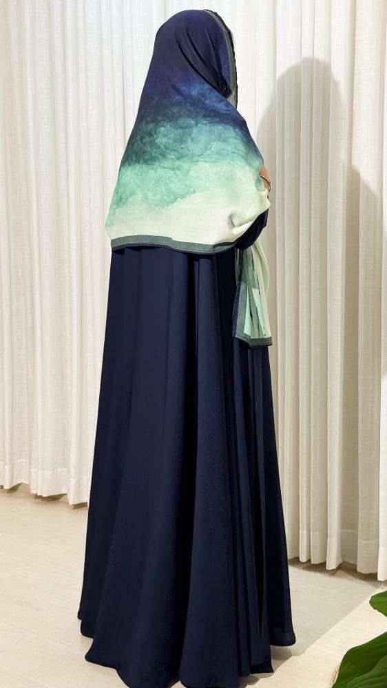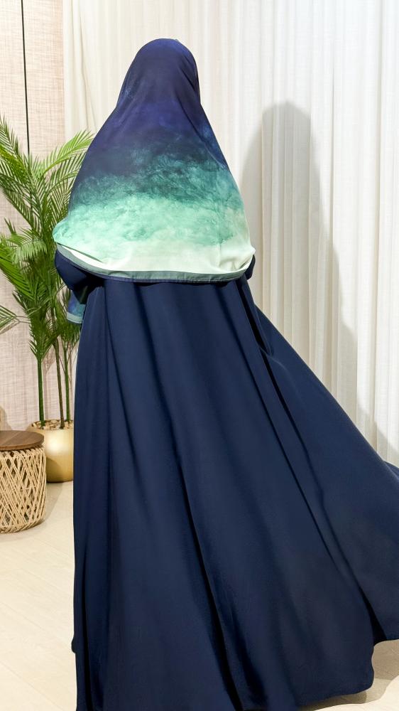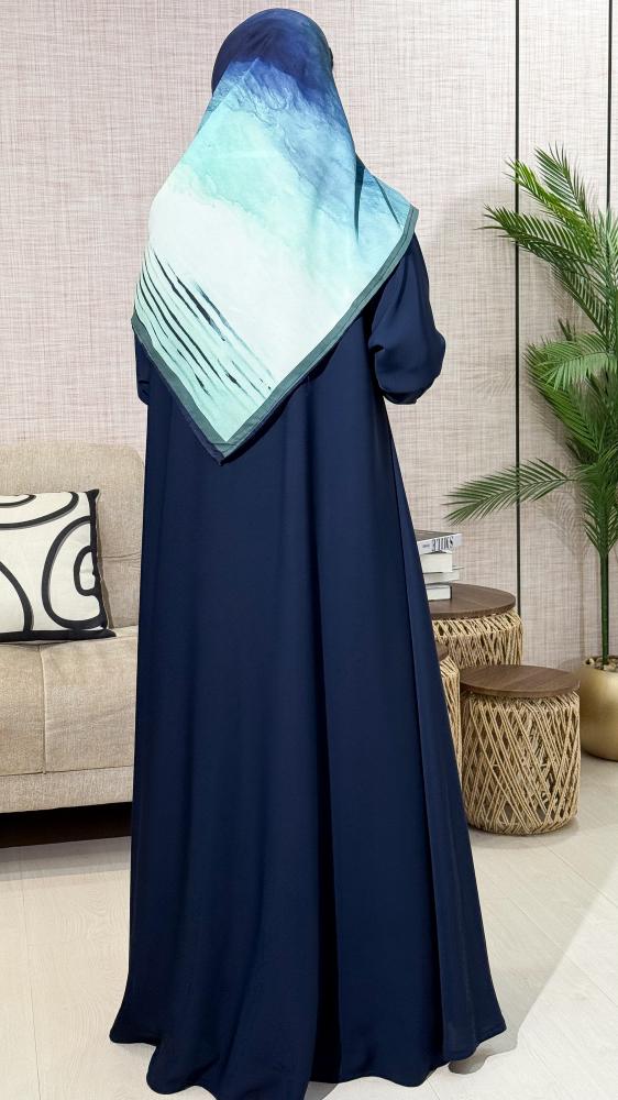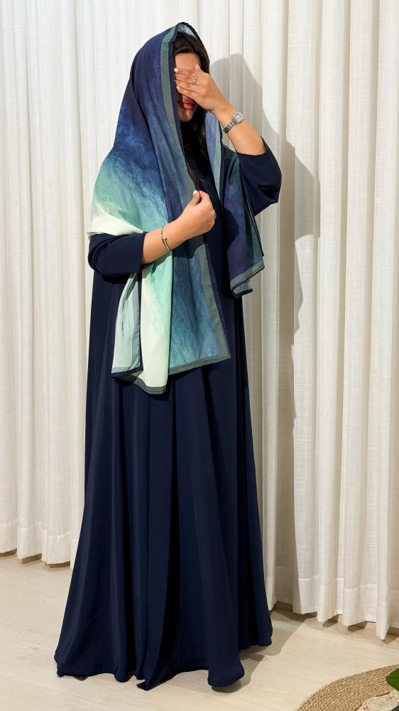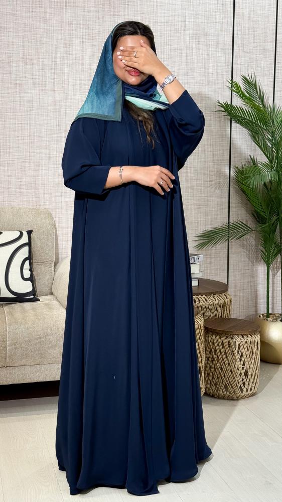 - عباية باللون الكحلي مصنوعة من قماش الكريب الكوري الذي يتميز بالنعومة والخفة، مما يساعد على الشعور بالراحة والانتعاش طوال اليوم.