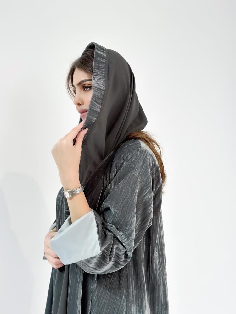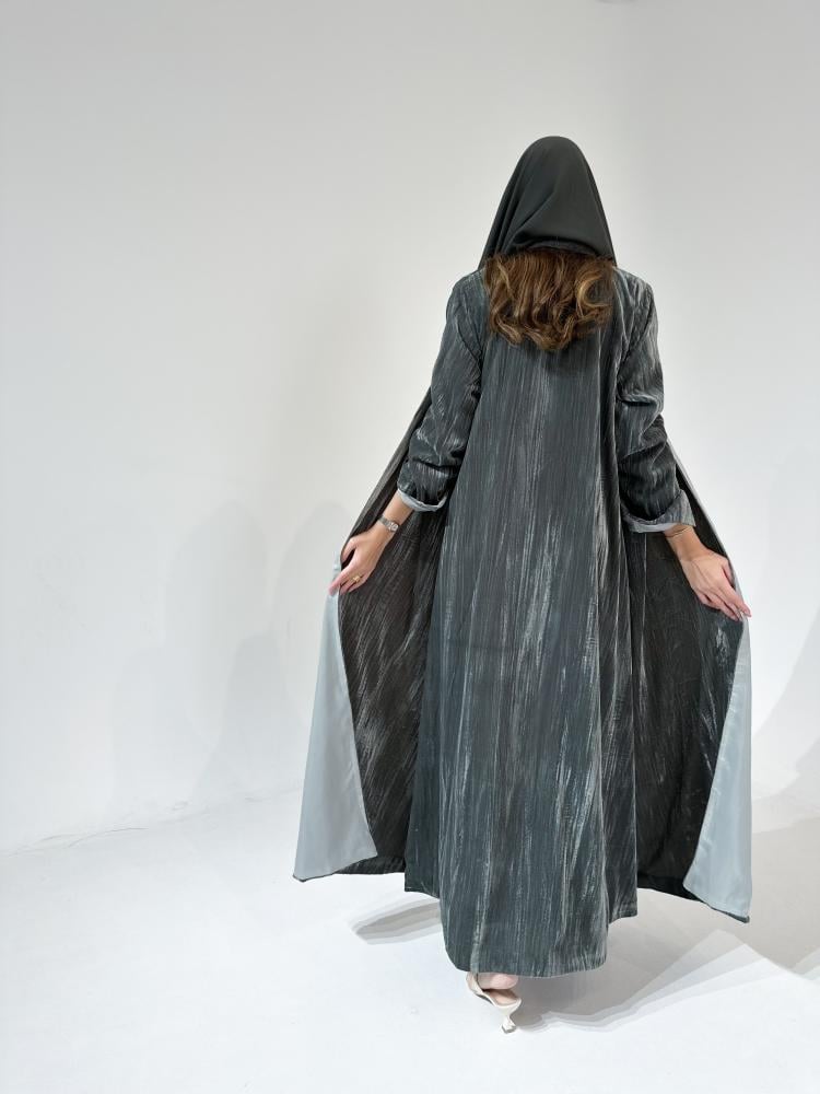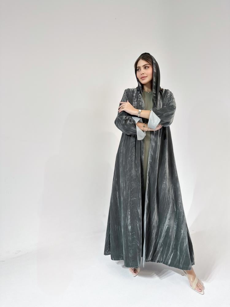 عباية شتوية مخمل يجمع اللونين الرمادي والزيتي بتصميم فخم وأنيق تناسب كل من تحب الإطلالات الشتوية الناعمة بلون رمادي حيادي يعزز فخامتها، انعمي بدفء خرافي وإطلالة تسحر العيون بشكل عصري لعبايات 2025 المميزة.