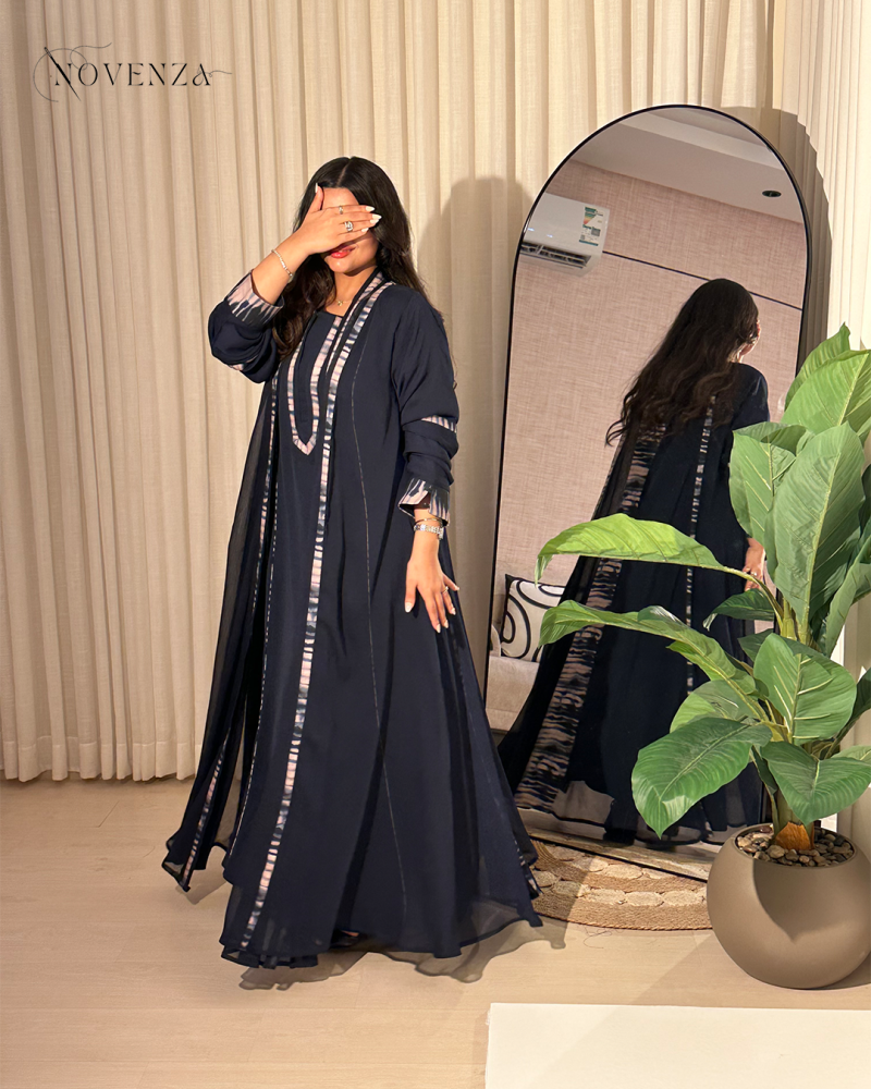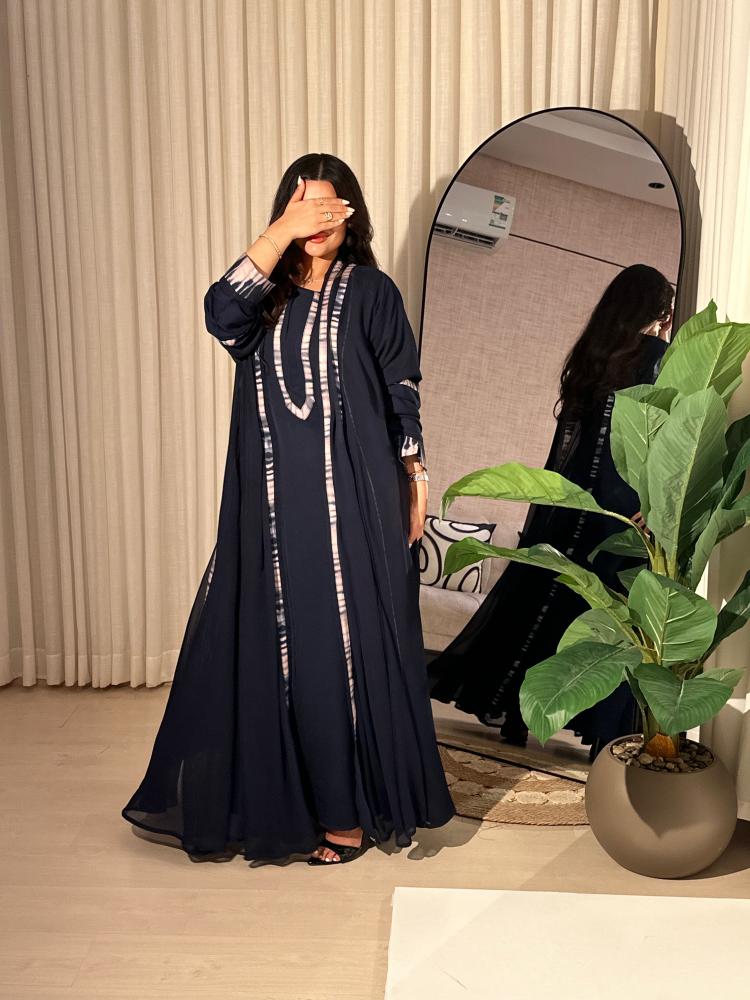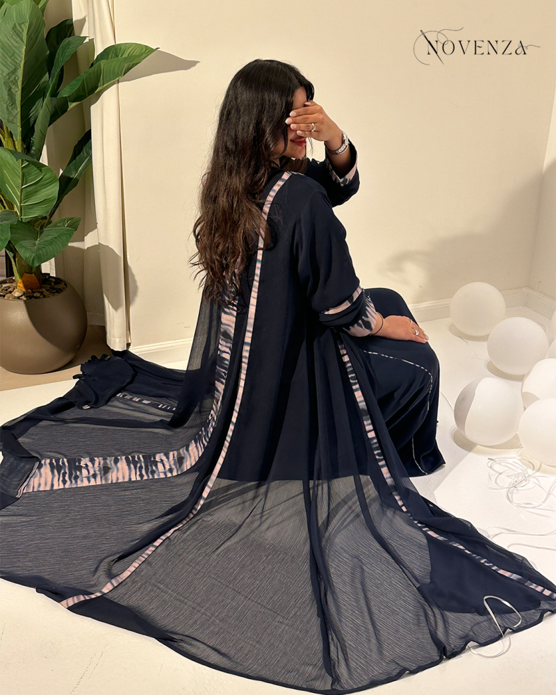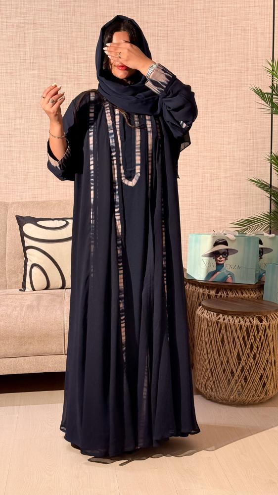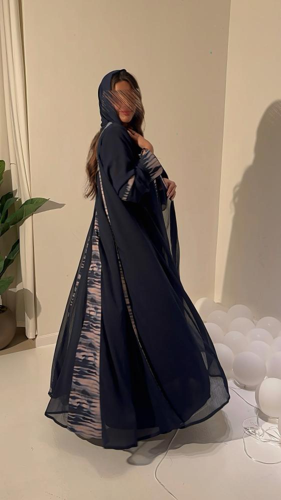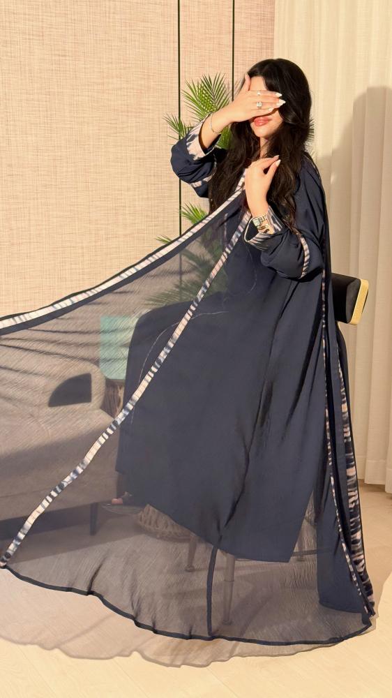 عباية شيفون كحلي مع تدخيلات من اللين بتصميم عصري و انيق