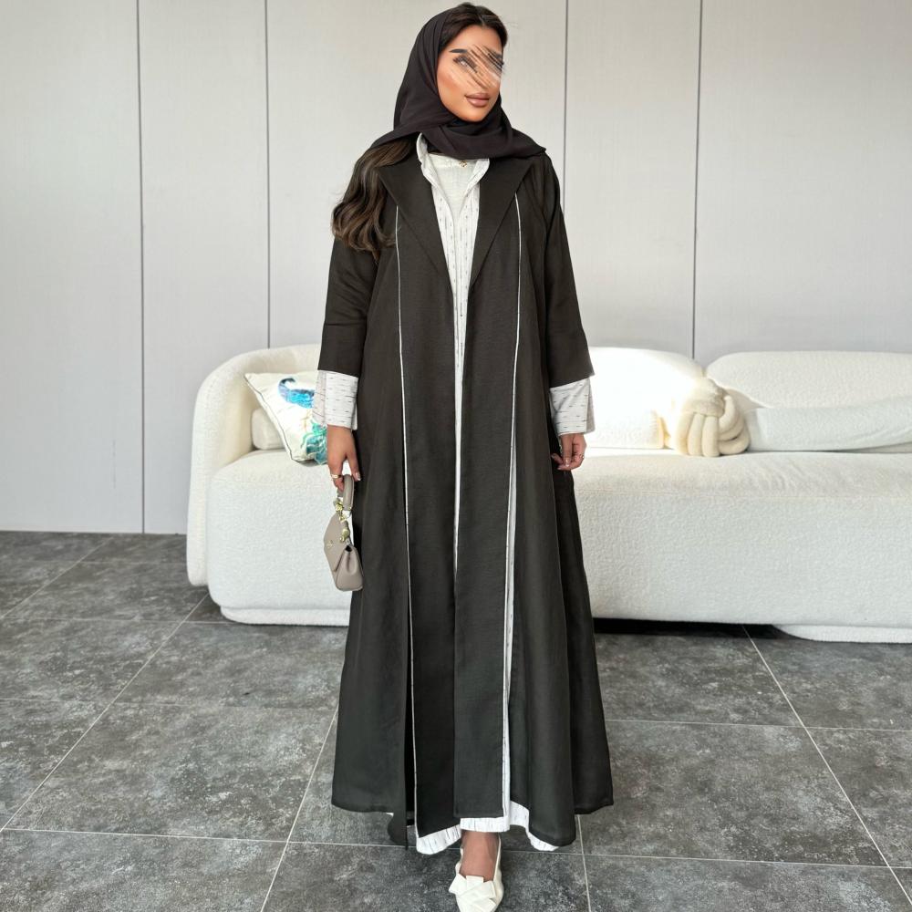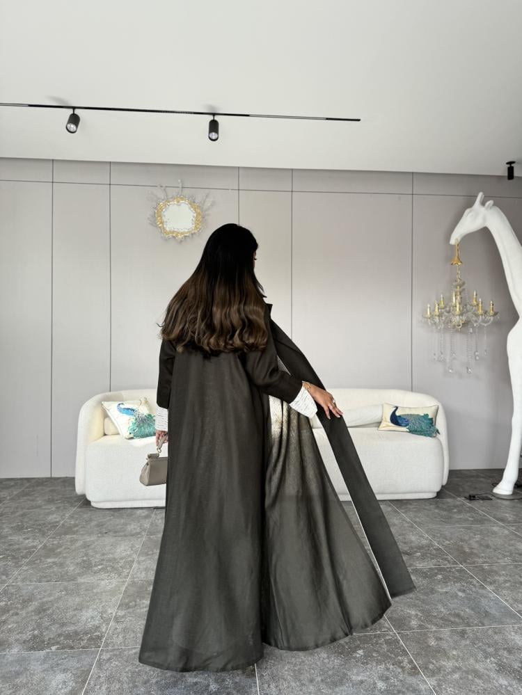 أضيفي لمسة من الفخامة الطبيعية إلى إطلالتك مع عباية قماش لينن طبيعي زيتي.