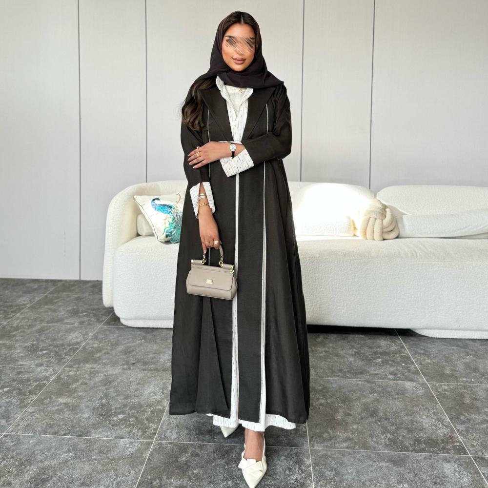 - ارتدي عباية قماش لينن طبيعي زيتي مع حقيبة صغيرة بلون النيود أو الأسود لإطلالة متوازنة.